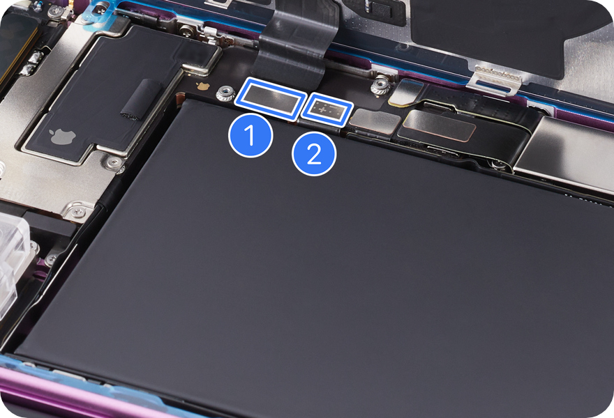 Press the end of the back glass flex cable (1) to the connector. Press the end of the battery flex cable to the connector (2).