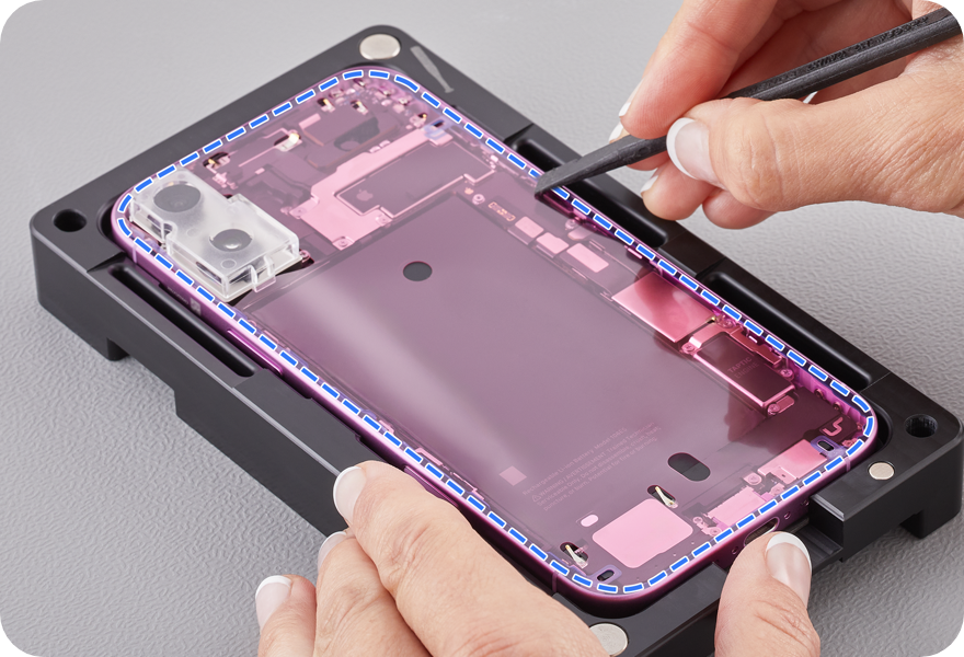 Use the adhesive removal tool or the black stick to lift the adhesive from the enclosure. Use the ESD-safe tweezers to pull the adhesive. Repeat this process until all the adhesive is removed from the perimeter of the enclosure.