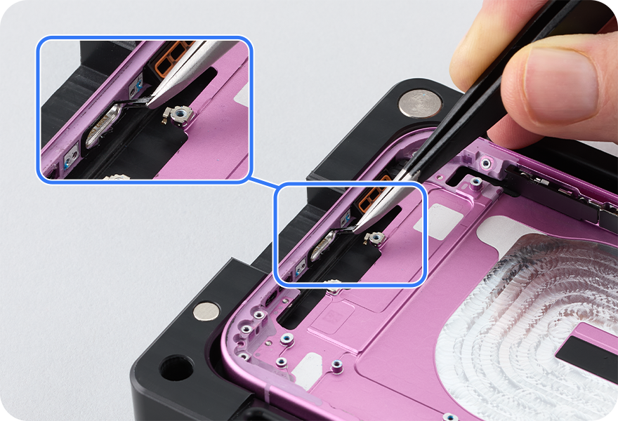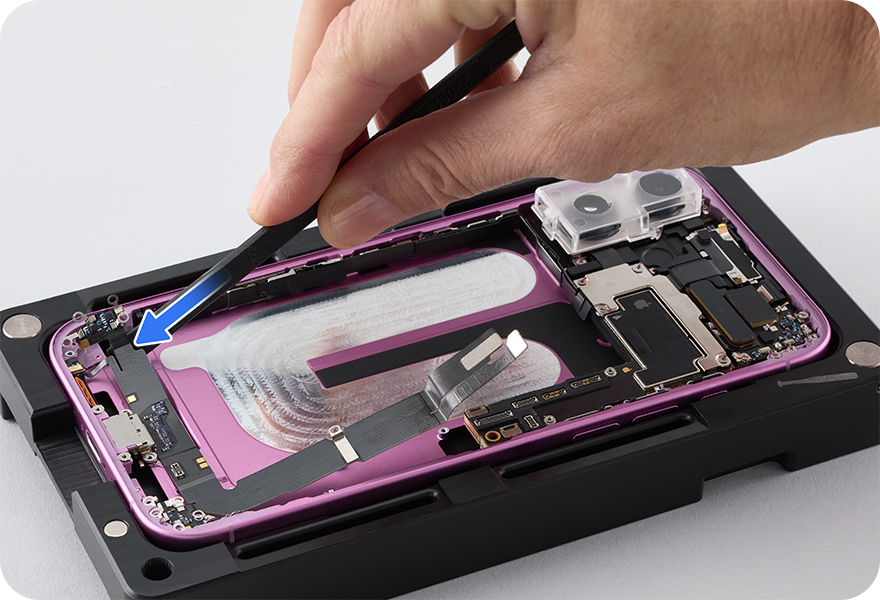 Lift the end of the USB-C connector flex cable as shown and peel the flex cable from the enclosure. Then remove the USB-C connector from the enclosure.