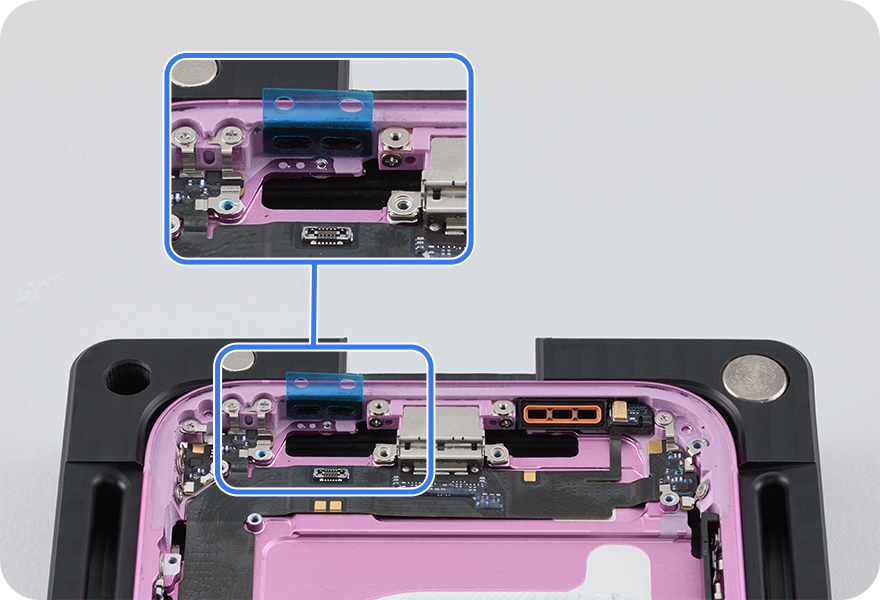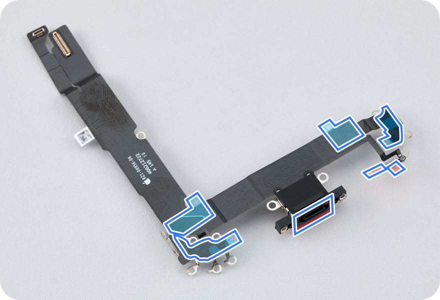 Remove all of the adhesive liners from the replacement USB-C connector, making note of the areas where adhesive is present.