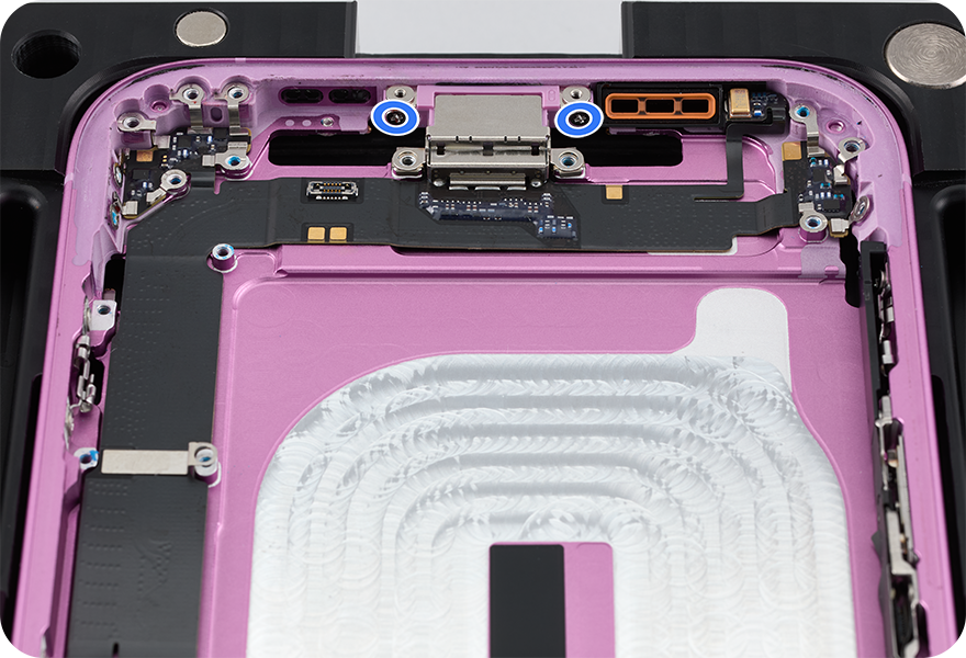 Use a torque driver and the JCIS bit to remove seven crosshead screws from the USB-C connector. Set aside the screws.