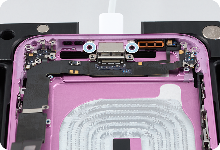 Use a torque driver and the long JCIS bit to remove two crosshead screws from the USB-C connector. Set aside the screws.