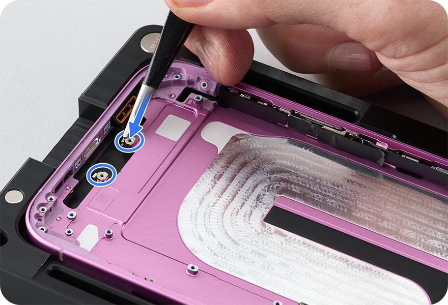 Use the gray torque driver and JCIS bit to install two new crosshead screws into the SIM assembly spacer.