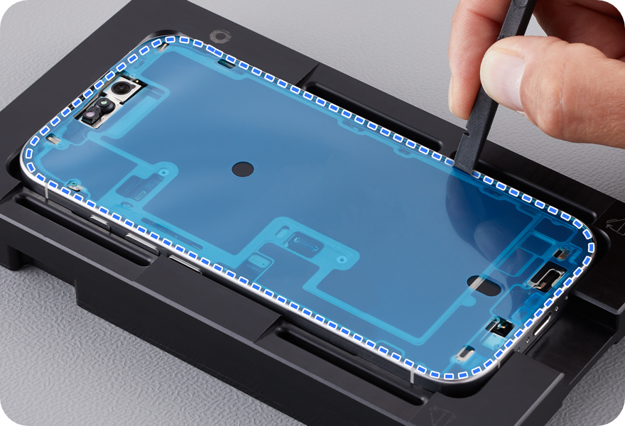 Use ESD-safe tweezers or the adhesive removal tool to pick up the display adhesive. Then pull the adhesive at a 45-degree angle to remove it. Repeat this process until all the adhesive is removed from the perimeter of the enclosure.