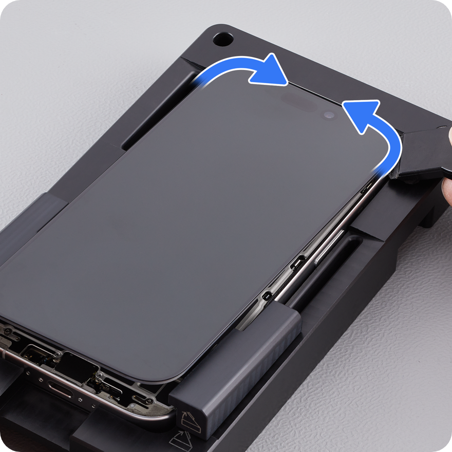 Position the repair tray with the iPhone in the display press and the display faceup. Pull down the lever until the display press locks.