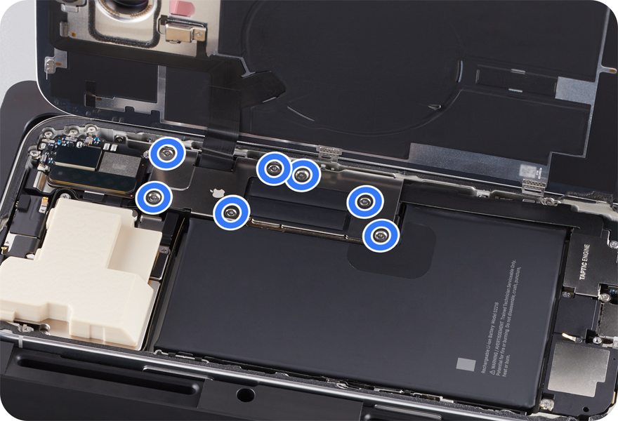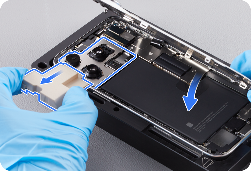 Caution: Don’t touch the camera assembly, TrueDepth camera grounding springs, or nearby parts.