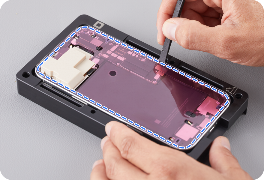 Use the adhesive removal tool or the black stick to lift the adhesive from the enclosure. Use ESD-safe tweezers or the adhesive removal tool to pull the adhesive. Repeat this process until all the adhesive is removed from the perimeter of the enclosure.