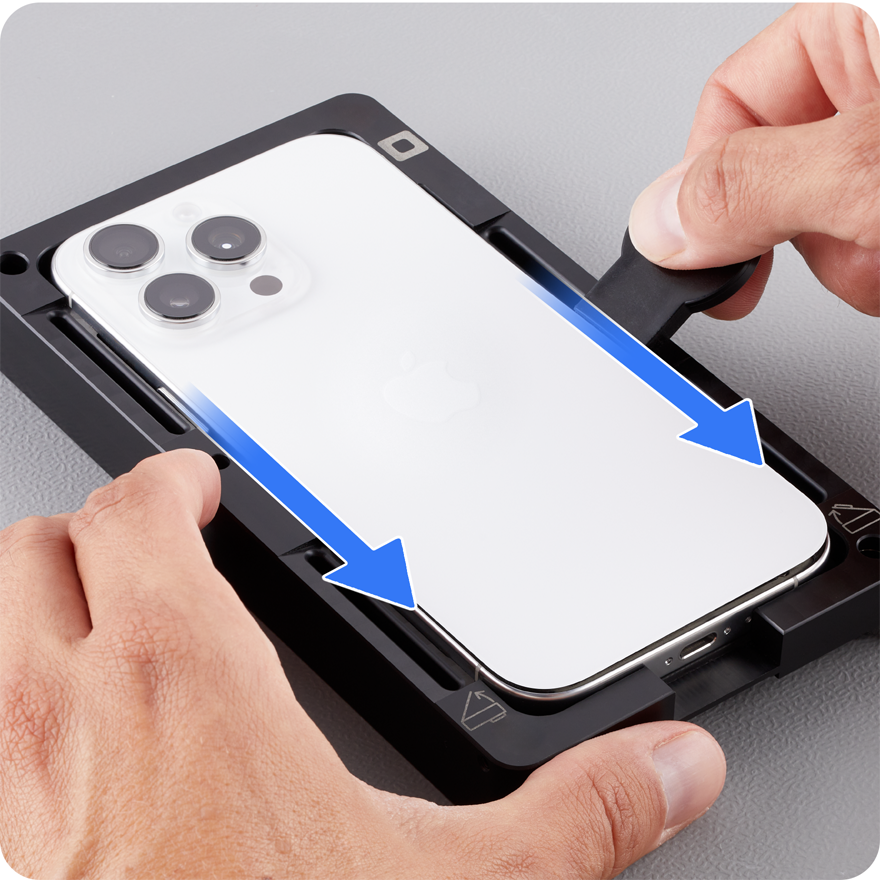 Remove the iPhone from the heated display removal fixture and place it in the repair tray with the back glass faceup and the USB-C port facing the cutout.