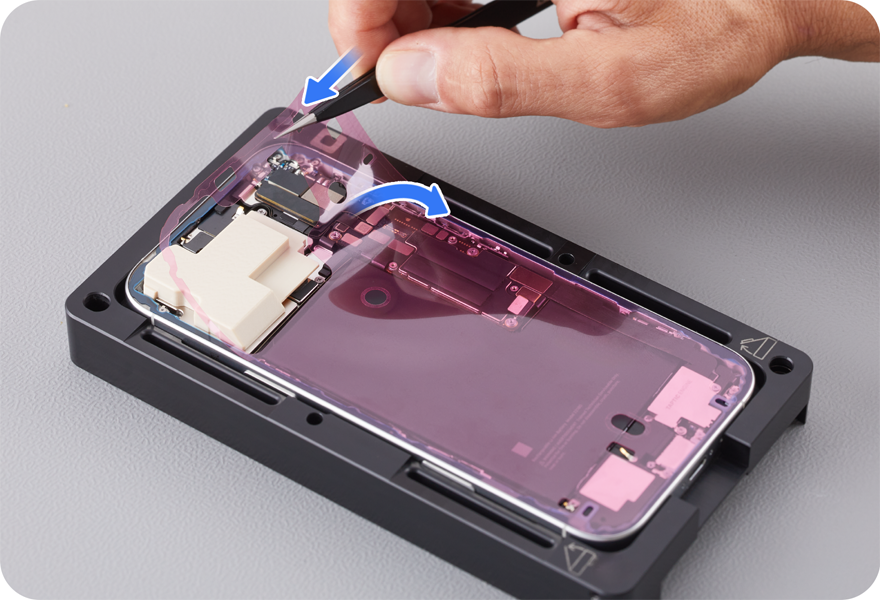The replacement back glass adhesive has a top release liner, a middle release liner, and a bottom release liner. Grasp the tab on the bottom release liner. Then slowly pull the bottom release liner out from under the adhesive while pressing the adhesive onto the enclosure.