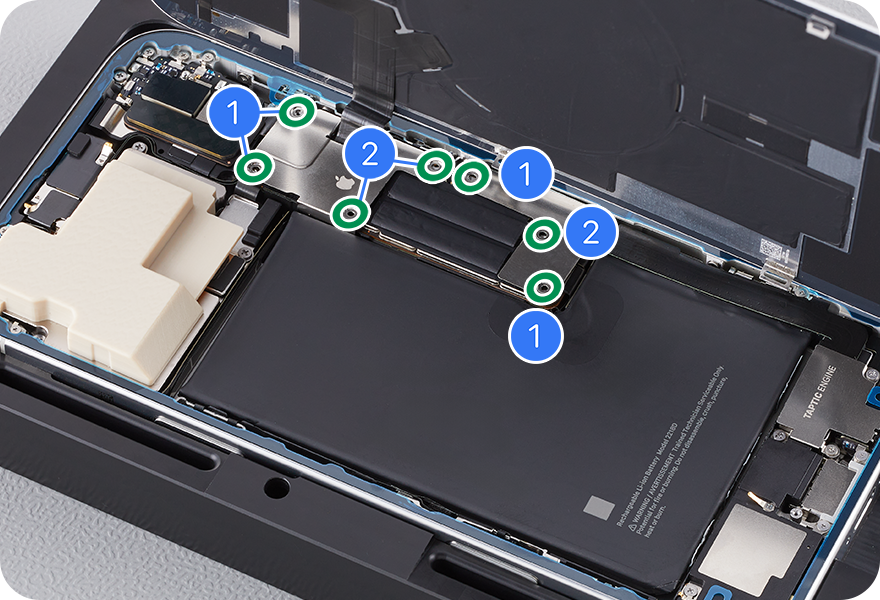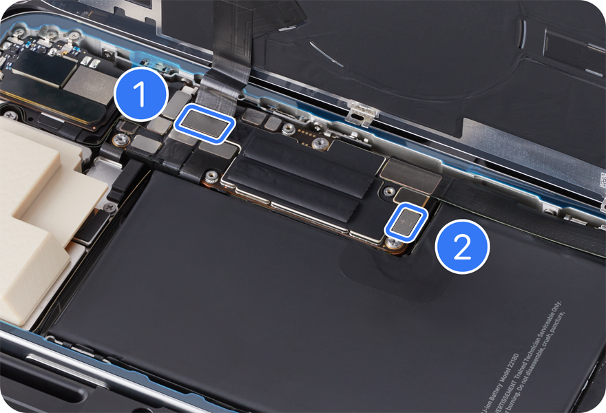 Press the end of the back glass flex cable to the connector (1). Press the end of the battery flex cable to the connector (2).
