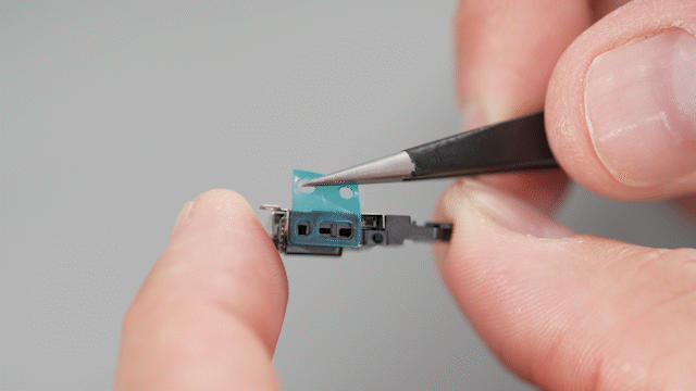 Use ESD-safe tweezers to peel the protective liner from the adhesive on the main microphone. Then position the main microphone in the enclosure by aligning the screw holes. Press and hold the top of the main microphone for 15 seconds to adhere it to the enclosure.