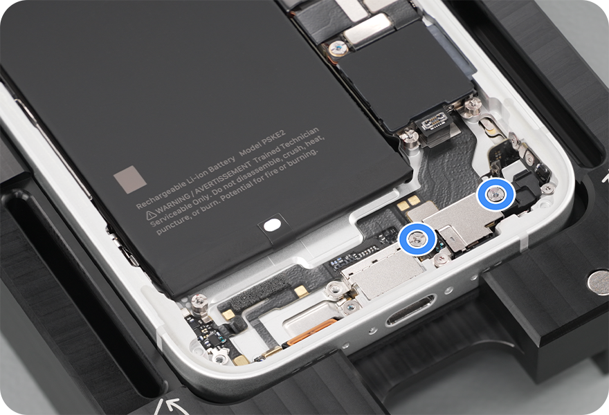 Set the torque value on the 10–34 Ncm adjustable torque driver to 10 Ncm. Use the adjustable torque driver and adjustable torque driver super screw bit to install two new super screws into the main microphone:
