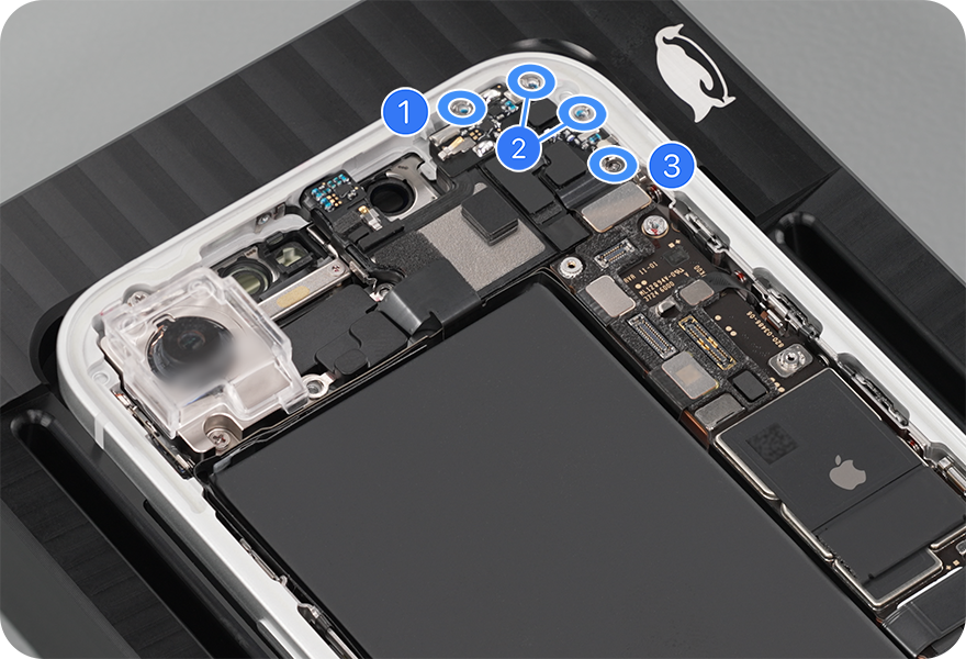 Use the blue torque driver and fixed driver JCIS bit to install one new crosshead screw (923-12366) (3) into the top speaker.