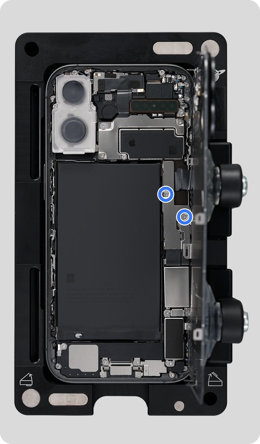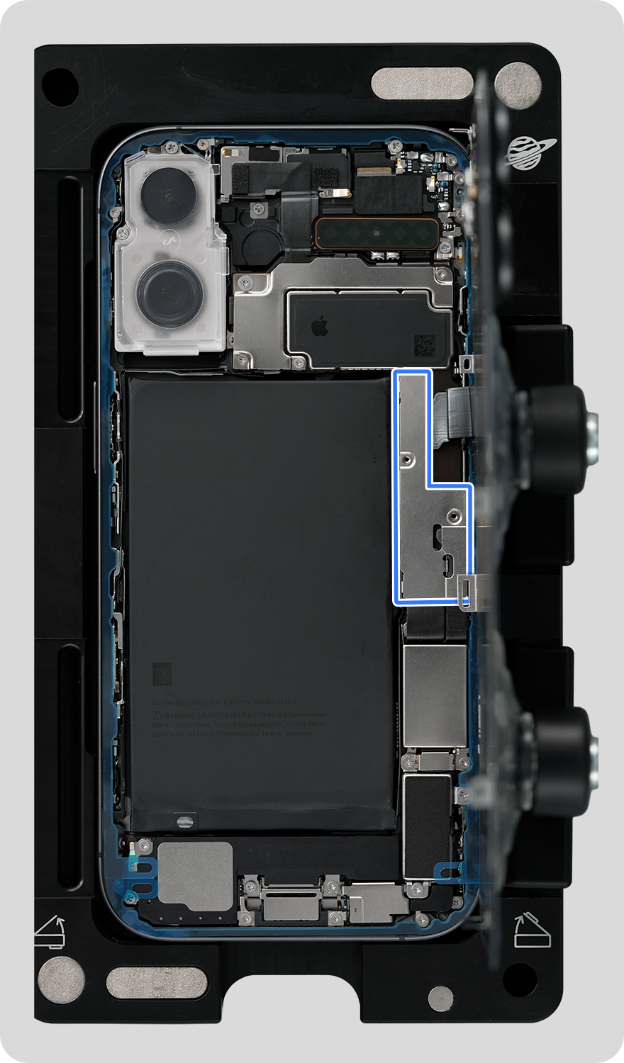 Remove the iPhone from the heated display removal fixture and place the iPhone in the repair tray with the back glass faceup and the USB-C connector facing the cutout.