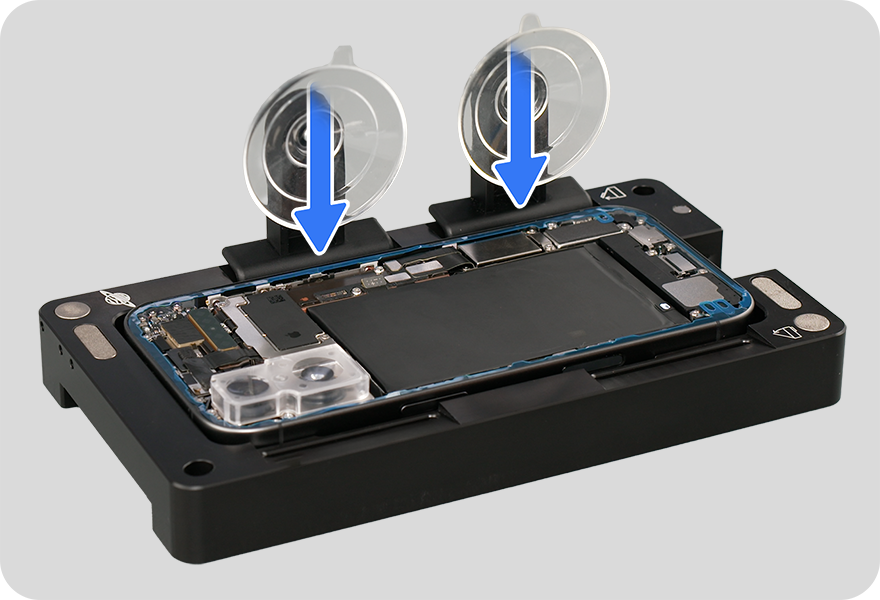 Turn the iPhone over in the repair tray so the display is faceup. Press the display on the four areas shown simultaneously.