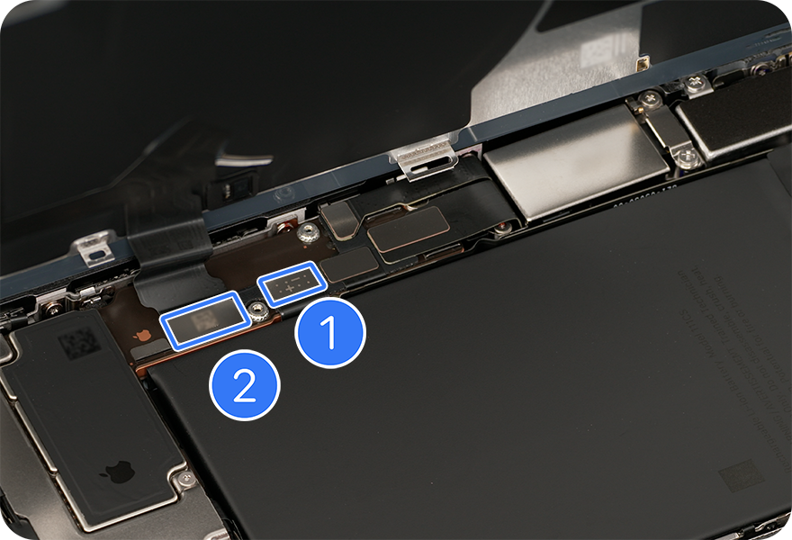Press the end of the back glass flex cable (1) to the connector. Press the end of the battery flex cable to the connector (2).