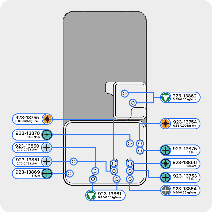 Set the torque value on the 10–34 Ncm adjustable torque driver to 10 Ncm. Use the adjustable torque driver and super screw bit to install one new super screw (923-13866) into the main microphone.