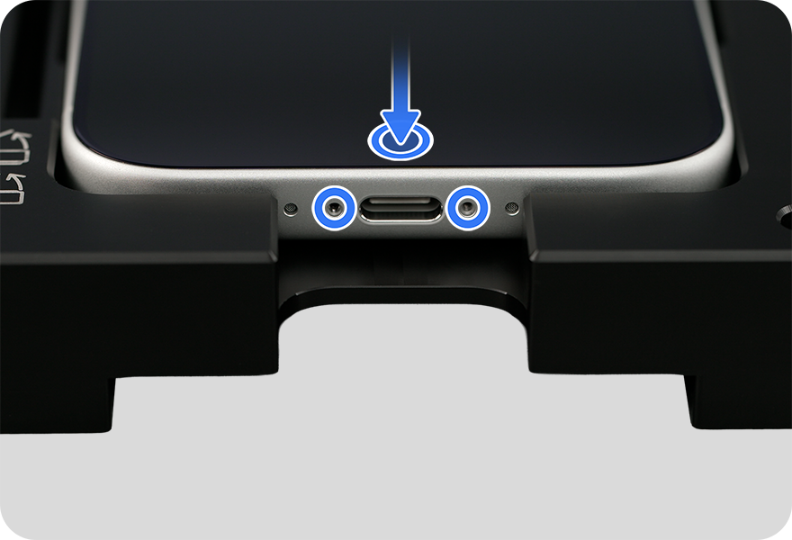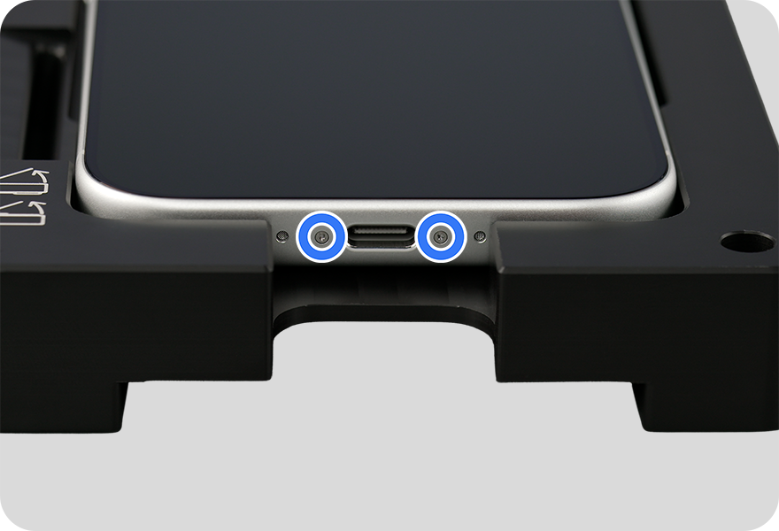 Use the blue torque driver and PL1.1 bit to install two new PL1.1 screws, one on each side of the USB-C connector. As you install the screws, press lightly on the display near the USB-C connector. Count five clicks from the torque driver as you install each screw to ensure the screw is fully installed.