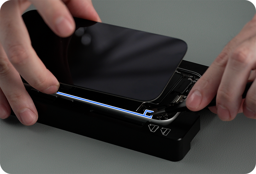 Use the adhesive cutter to cut along the left and right sides of the display, stopping at the antenna bands.