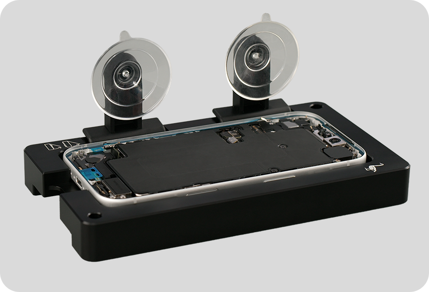 Hold the display by the edges as you pull the tabs on the suction cups to release them. Then remove the suction cups from the repair tray.