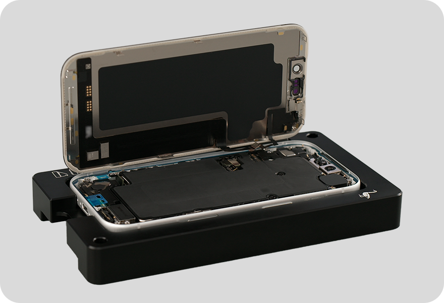 Remove the iPhone from the heated display removal fixture and place it in the repair tray with the display faceup and the USB-C connector facing the cutout.