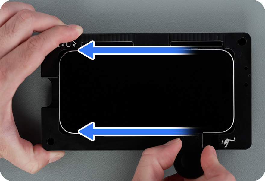 The replacement display adhesive has a top release liner, a middle release liner, and a bottom release liner. Grasp the tab on the bottom release liner. Then slowly pull the bottom release liner out from under the adhesive while pressing the adhesive onto the enclosure.