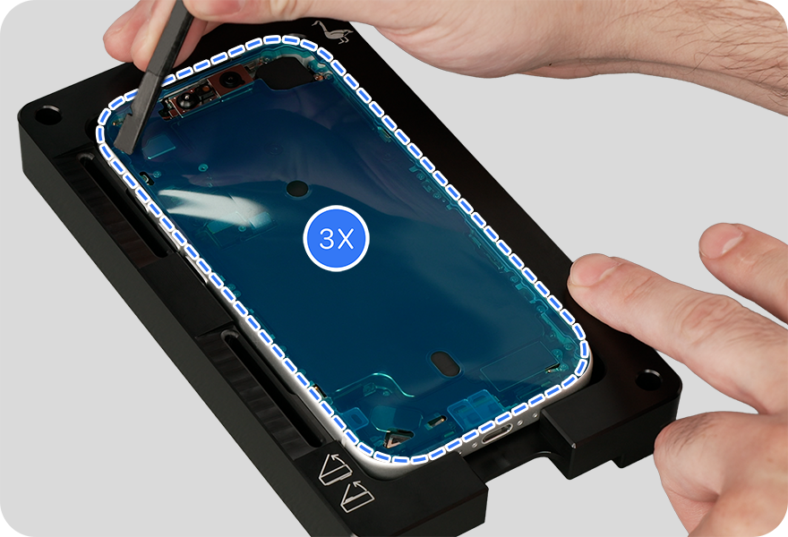 Use ESD-safe tweezers or the adhesive removal tool to pick up the display adhesive. Then pull the adhesive at a 45-degree angle to remove it. Repeat this process until all the adhesive is removed from the perimeter of the enclosure.