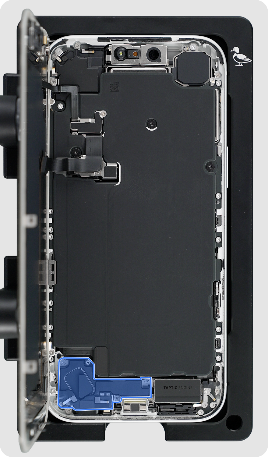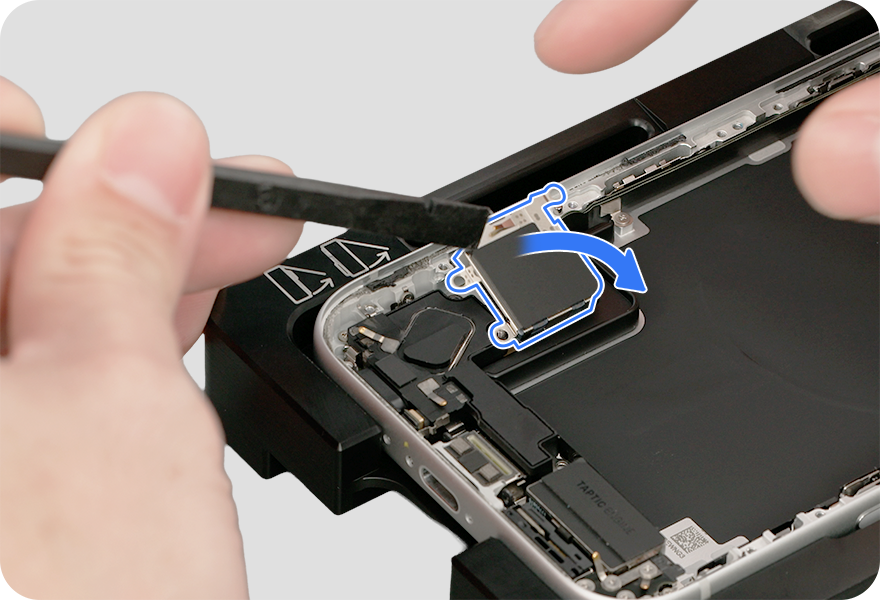 Use the black stick to separate the Taptic Engine battery shim from the bottom speaker.