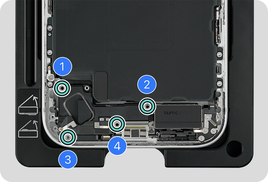 Set the torque value on the 10–34 Ncm adjustable torque driver to 13 Ncm. Use the adjustable torque driver and crosshead bit to install four new crosshead screws into the bottom speaker.