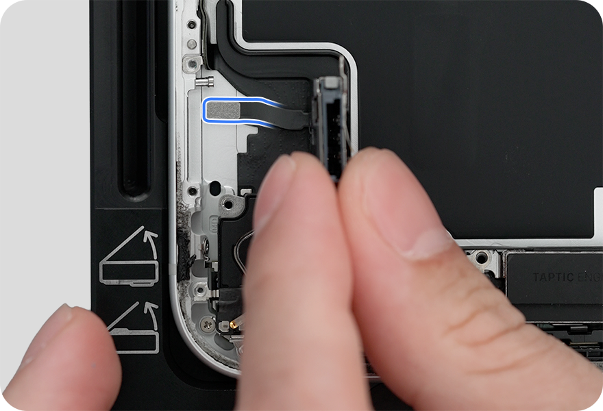 Tilt up the SIM assembly to access the flex cable underneath.