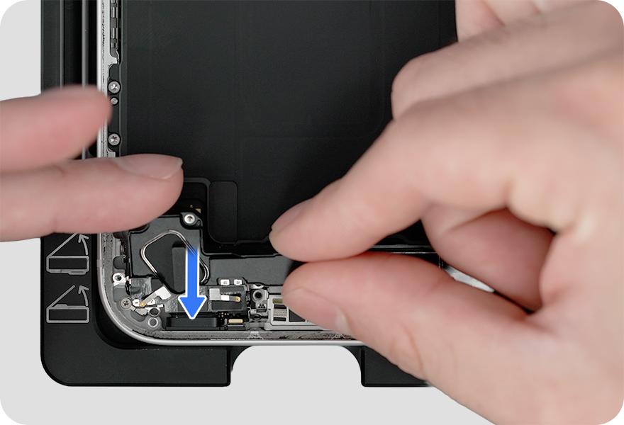 Lower the SIM assembly into the enclosure. Press the end of the SIM assembly flex cable to the connector. Then complete the entire step before continuing to the next step.