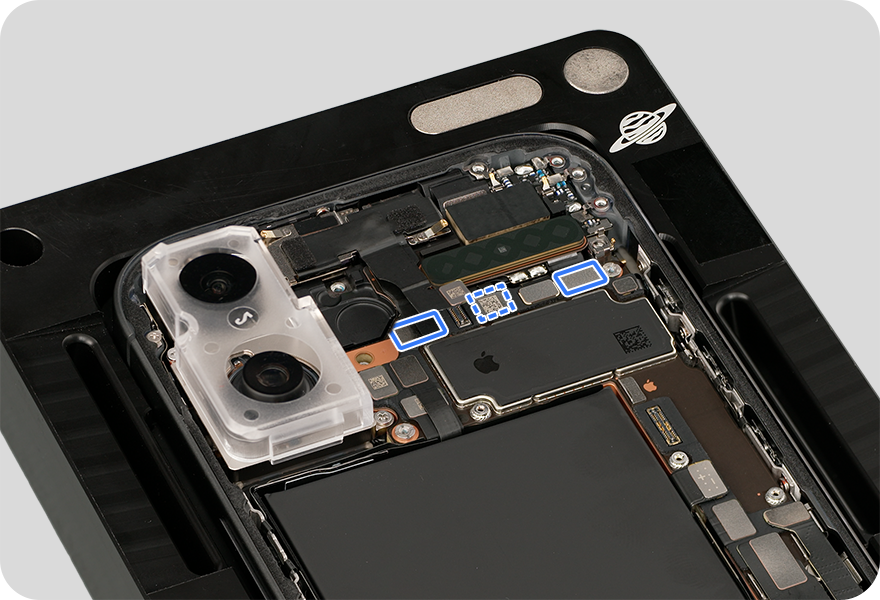 To remove the back glass 1 antenna (for mmWave antenna models), use ESD-safe tweezers to grasp the adhesive tab on the bottom right edge of the back glass 1 antenna and begin to gently pull out the tab. Wiggle side to side and twist the adhesive around the tweezers. Then continue to pull and twist until the antenna is free. Set the antenna aside for reassembly.