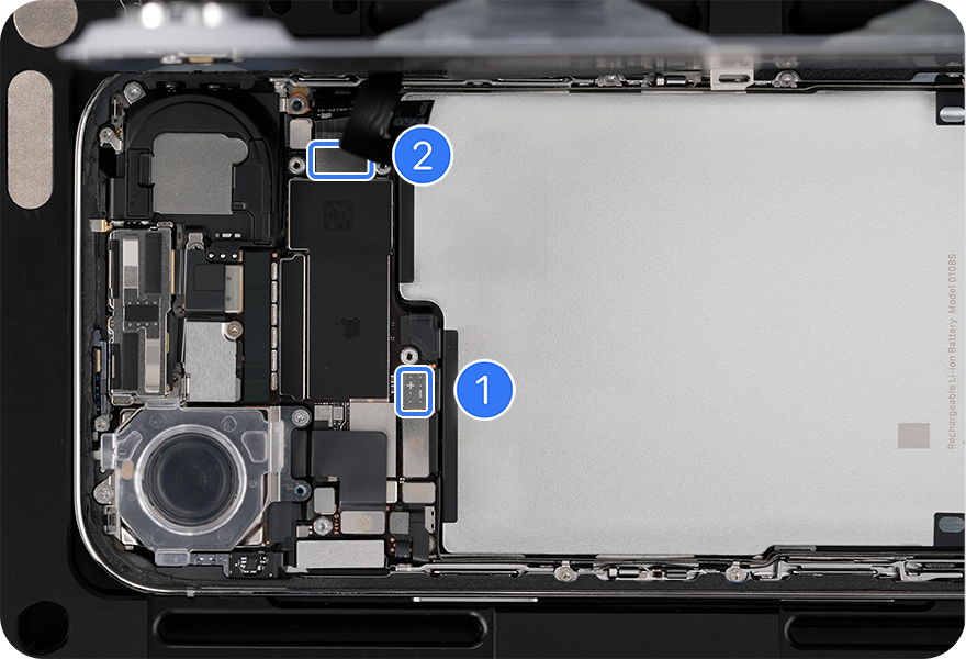 Lift the end of the battery flex cable off the connector (1). Then lift the end of the back glass flex cable off the connector (2).