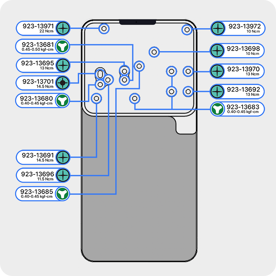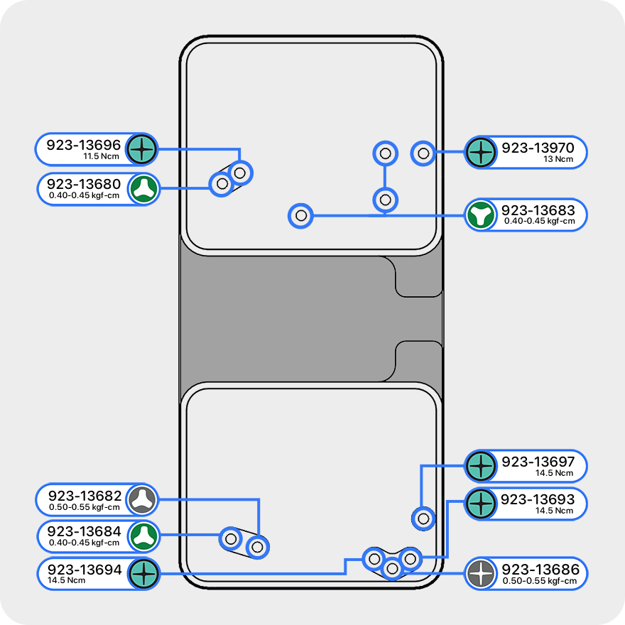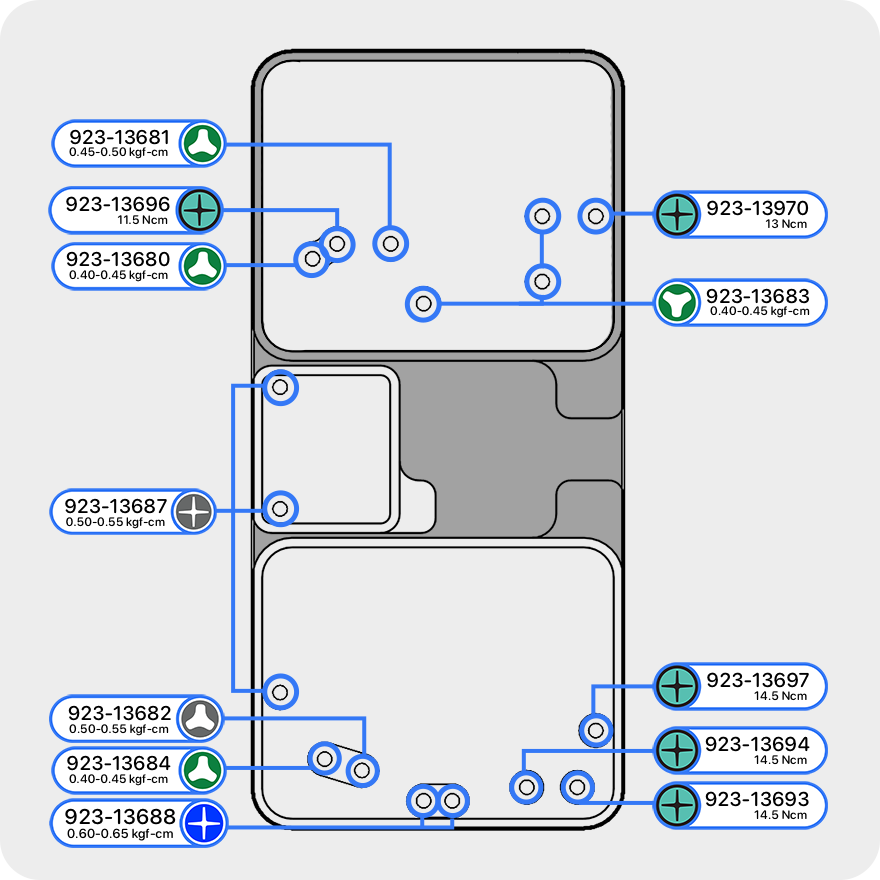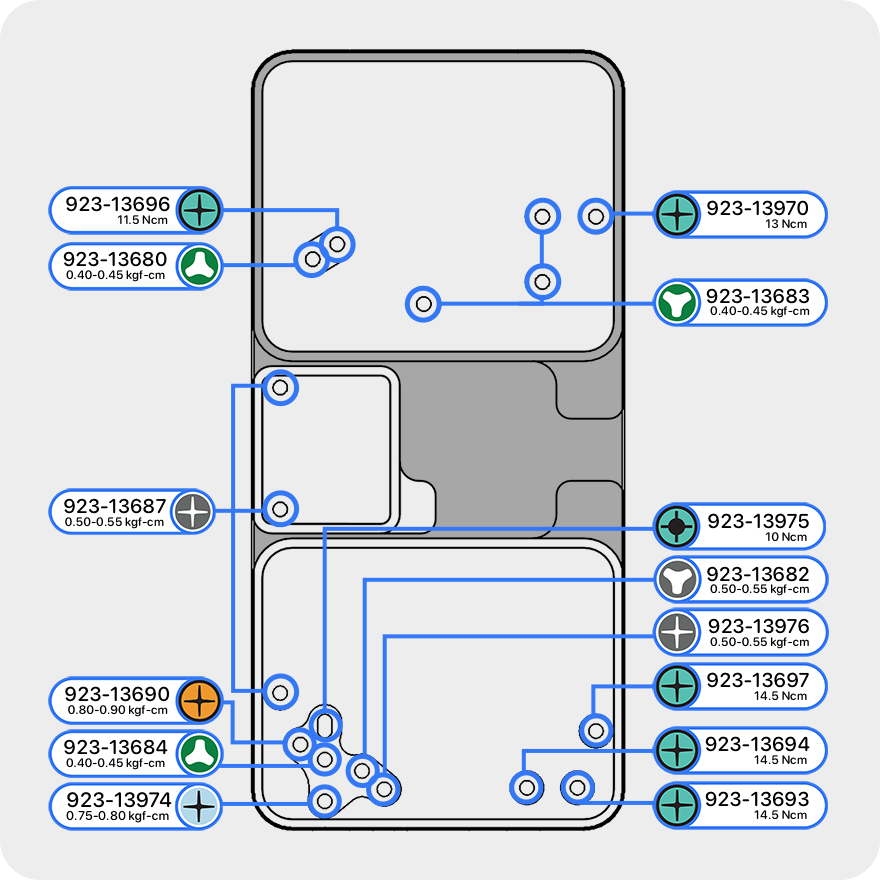 Screw diagrams show the screws contained in each screw tray. A screw tray includes all the new screws needed for each repair. Screw diagrams show you where the new screws in each repair procedure should be installed and which torque drivers and bits to use. Screw diagrams also appear in individual repair articles.