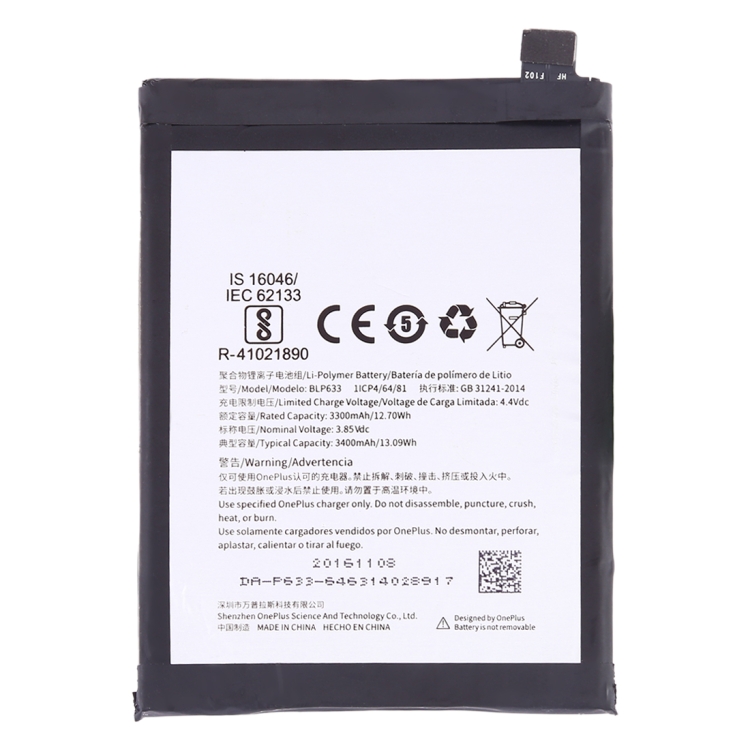 1. Li-Polymer battery for OnePlus 3T 2. Best replacement for the original battery with comparable standby and talk time 3. The Li-Polymer battery provides excellent continuous power sources to your device 4. Use the authorized charger only 5. If you don't use the battery for a long time, please put it in a dry and cool place and make it full charged once every three months 6. Compared with Nickel-Cadmium battery, the Li-polymer battery has no memory effect