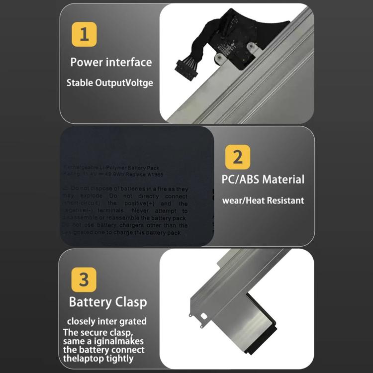 1. Model: A1965 2. Battery Voltage: 11.4V 3. Type: Li-Polymer 4. Certification: CE 5.Applicable computer models: For Apple MacBook Air 13-inch 2018 model (A1932) For Apple MacBook Air 13-inch 2019 model (A1932) MRE82xx/A, MREA2xx/A, MREE2xx/A, MRE92xx/A, MREC2xx/A, MREF2xx/A MUQT2xx/A, MUQU2xx/A, MUQV2xx/A, MVFH2xx/A, MVFJ2xx/A, MVFK2xx/A MVFL2xx/A, MVFM2xx/A, MVFN2xx/A, MVH62xx/A, MVH82xx/A, MVH22xx/A MVH42xx/A, MVH52xx/A, MWTJ2xx/A, MWTK2xx/A, MWTL2xx/A For Apple MacBook Air 13-inch 2020 early model (A2179)